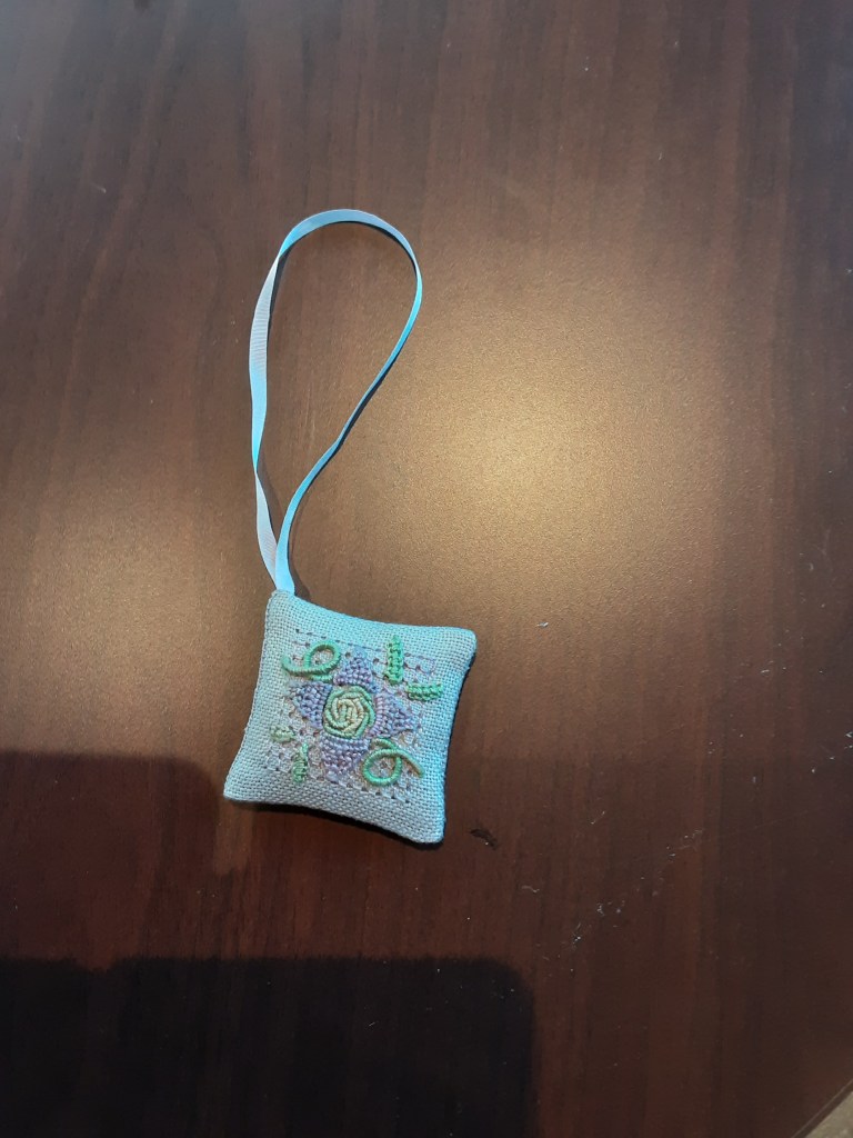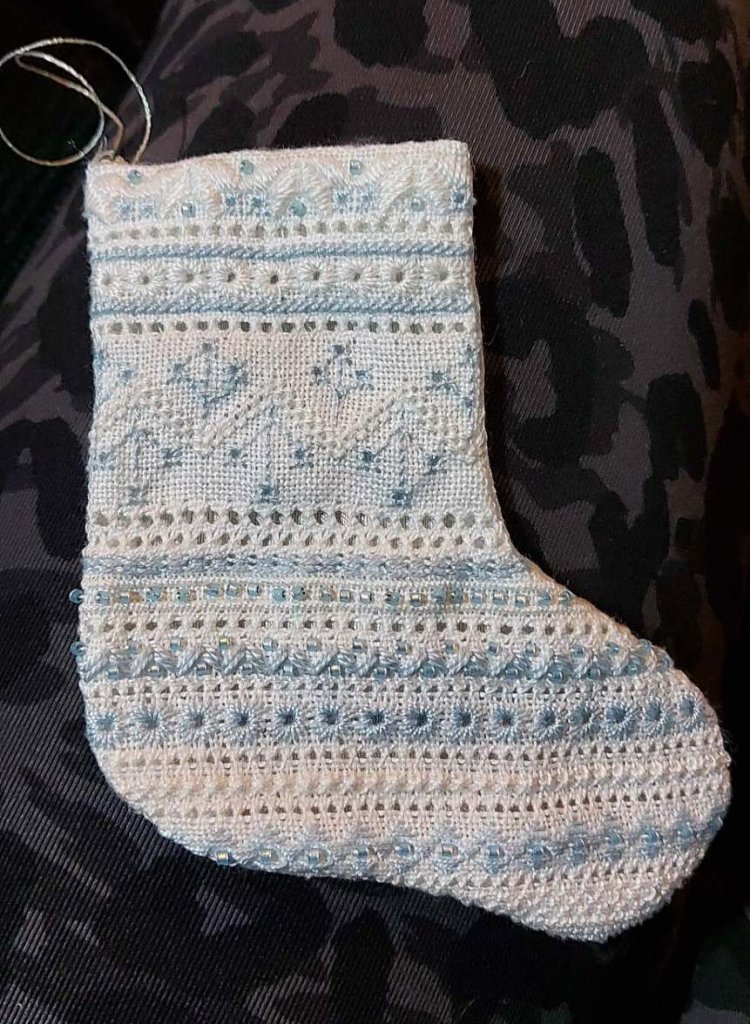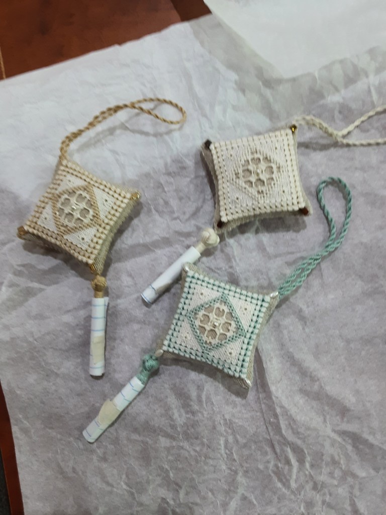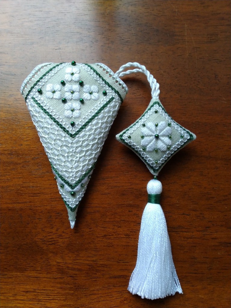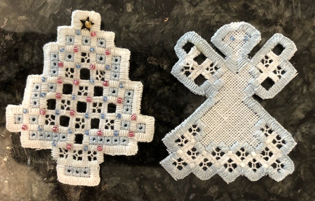 scissor fob in Casalguidi. Carolyn showed a Hardanger ornament she stitched and also a runner that