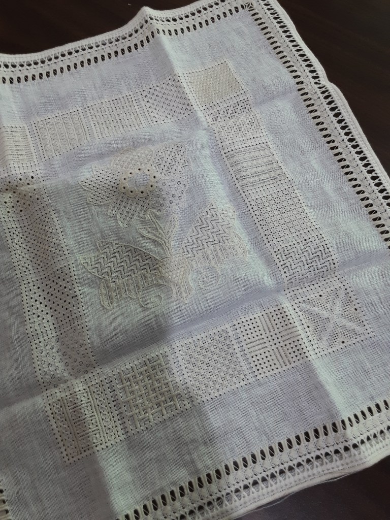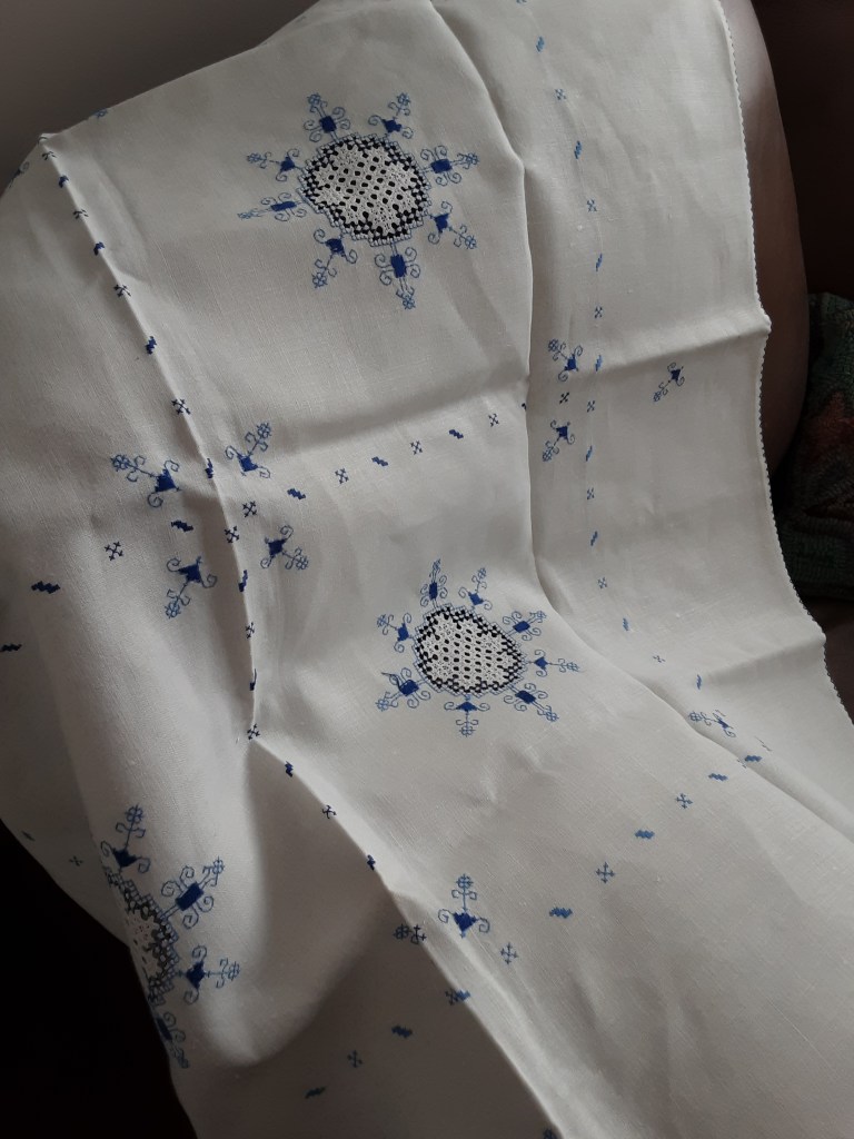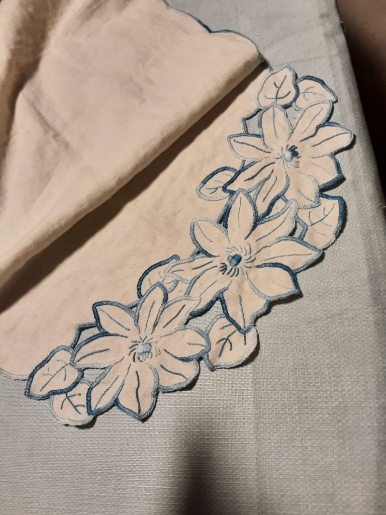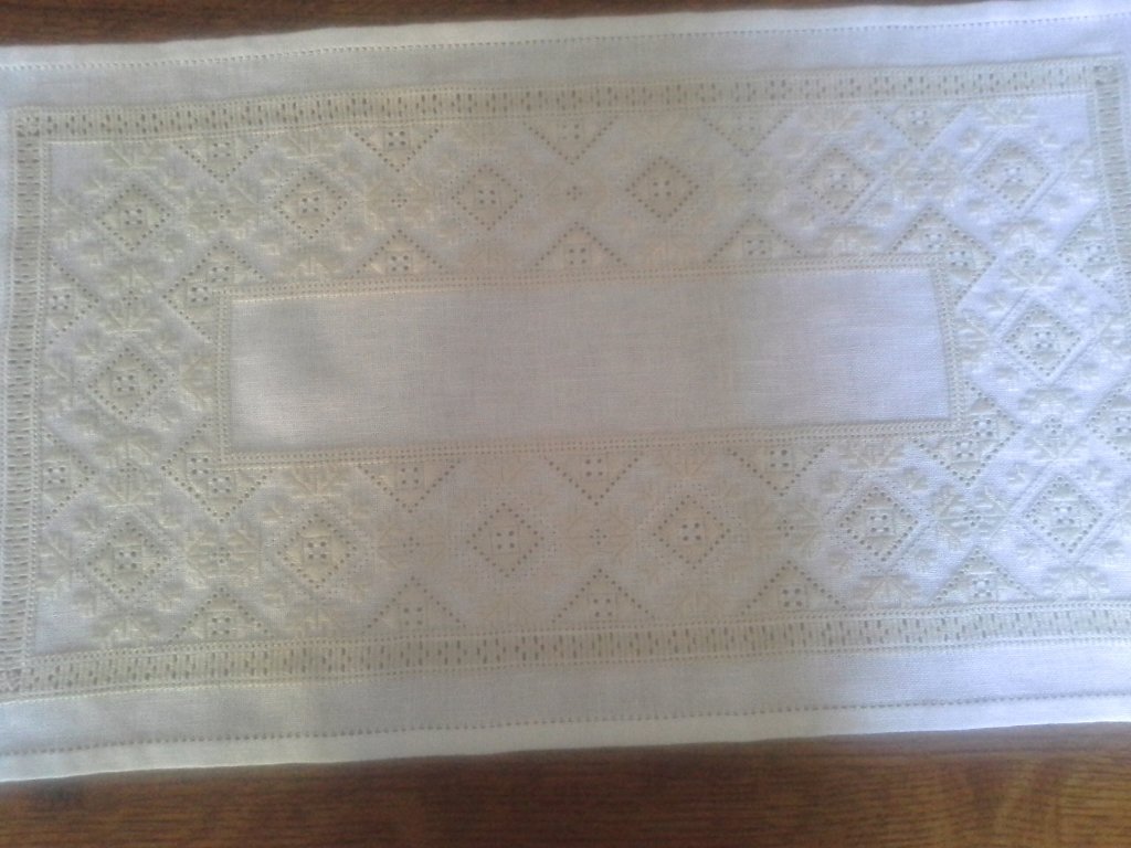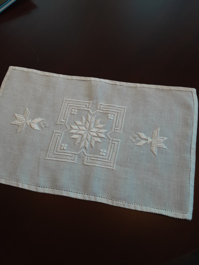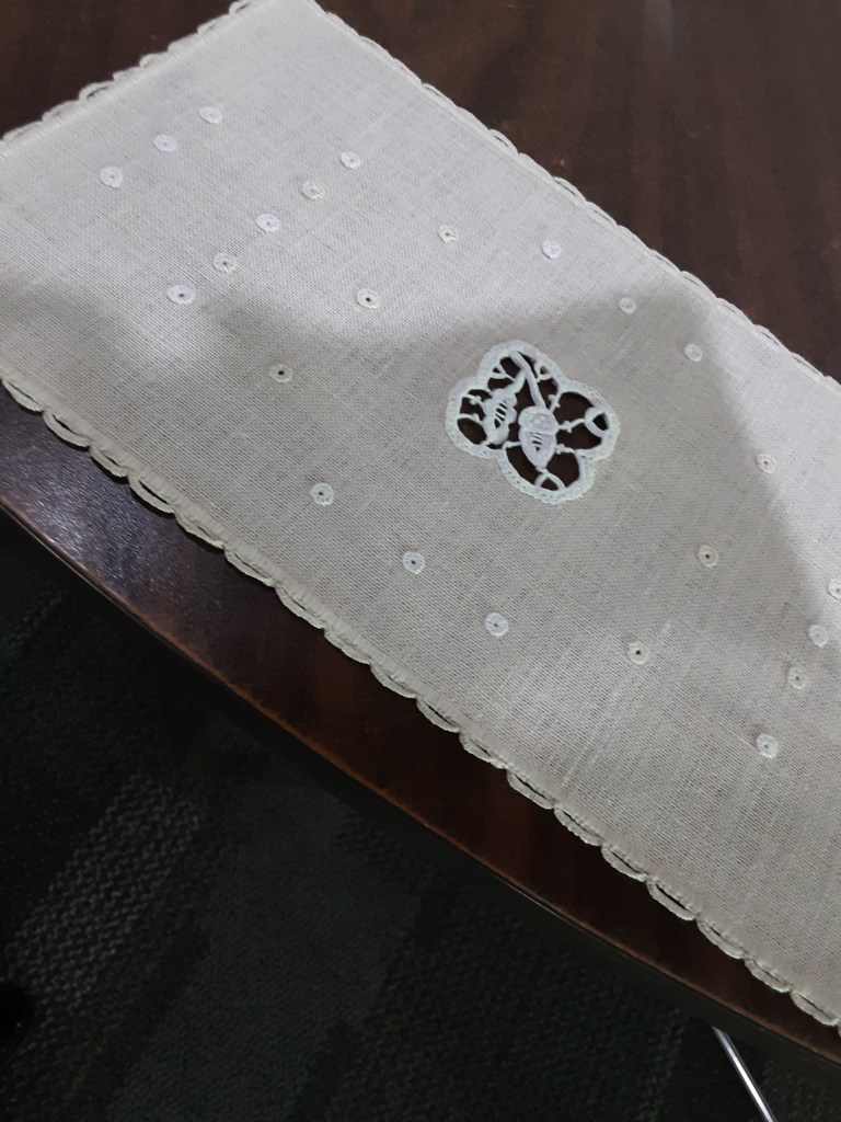a cut work runner (not yet washed and ironed) that was started by an anonymous stitcher many decades