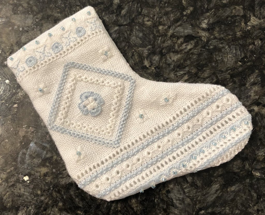 Our group of stitchers, who enjoy learning many techniques of whitework embroidery, have kept in touch during COVID through e-mail notes. Before ending in-person meetings months ago we were trying Ukranian whitework with the help of one of our members, Jan Eaton’s book and patterns by Terri Bay. Our photos with this report show bags, Christmas stockings and a runner stitched in this technique. At this time we do not have confirmation of times and a place for meeting in the fall.