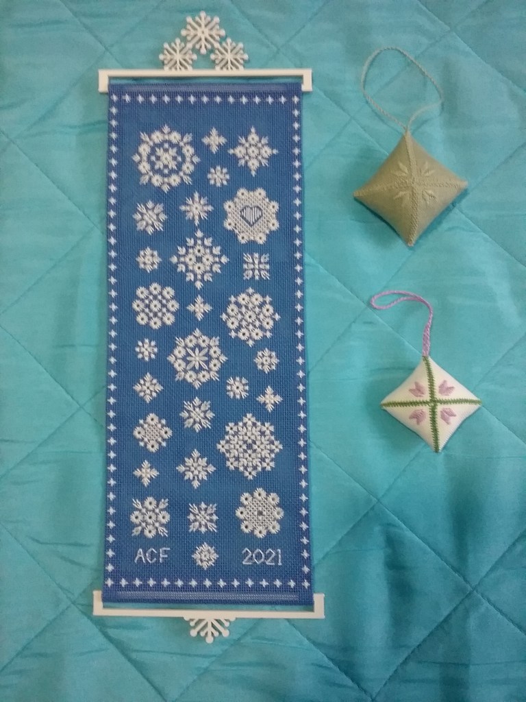 Alice has been busy finishing a number of projects pictured below: a Hapsburg lace sampler (T. Berlin design), a drawn thread towel (B. Kershaw design), Flower Garden (blackwork and Hardanger designed by C. Storie) and a couple of ornaments.