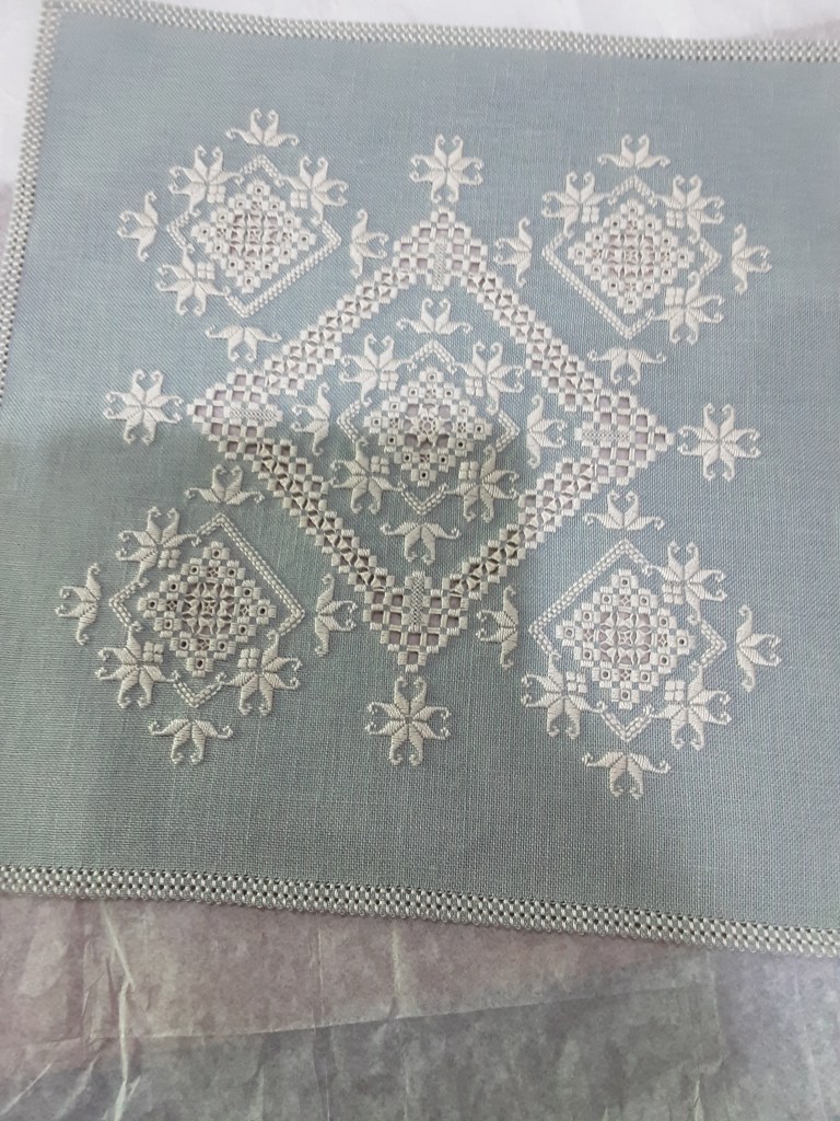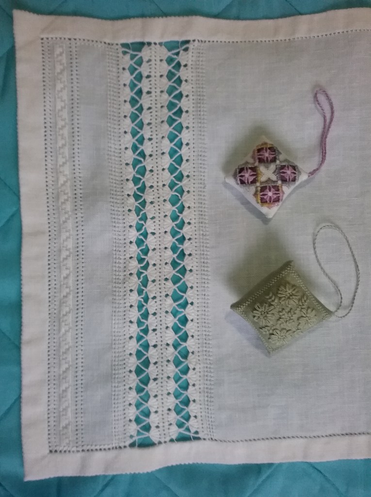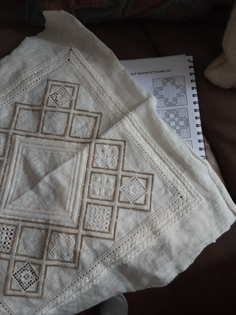 Since then we have completed other pieces of whitework. Alice stitched two small Hardanger pieces as well as the large one, her own designs. Alice’s pulled thread embroidery designed by Jette Roy Finlay is also shown.