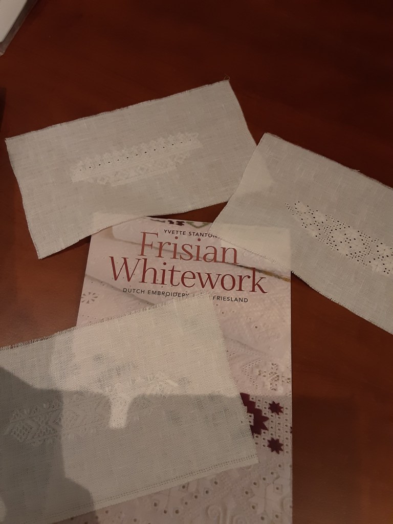 We are working on designs in 2 techniques, a Danish Hedebo pulled thread project by Jette Roy Finlay and a Ukranian whitework embroidery by Terri Bay.