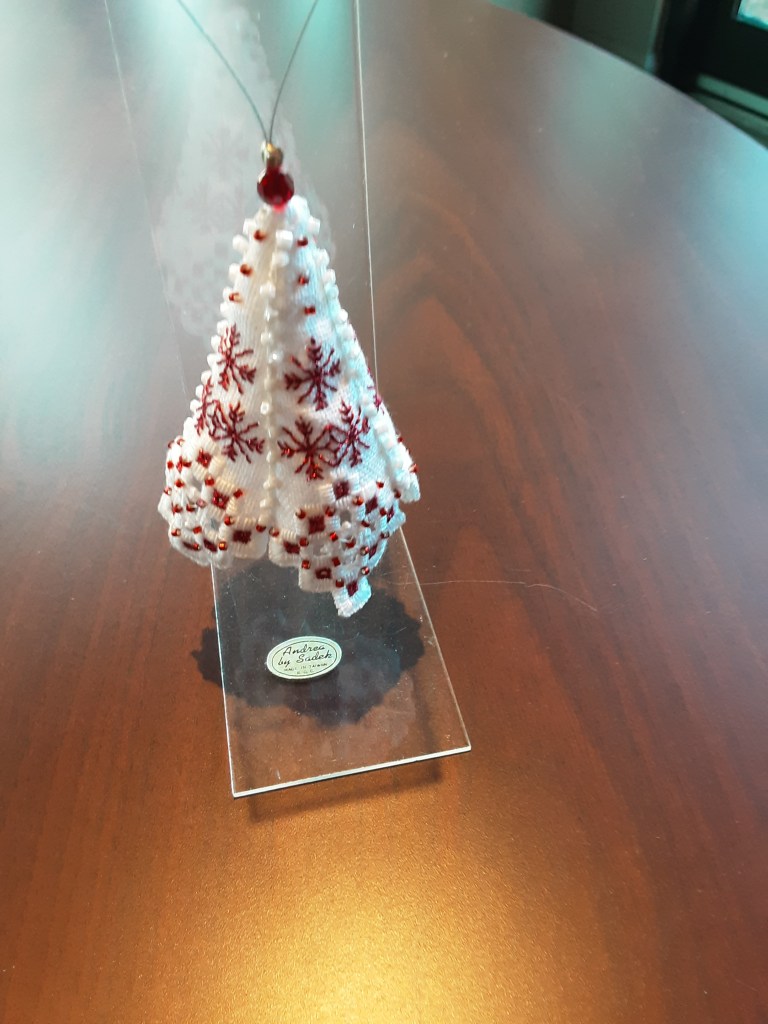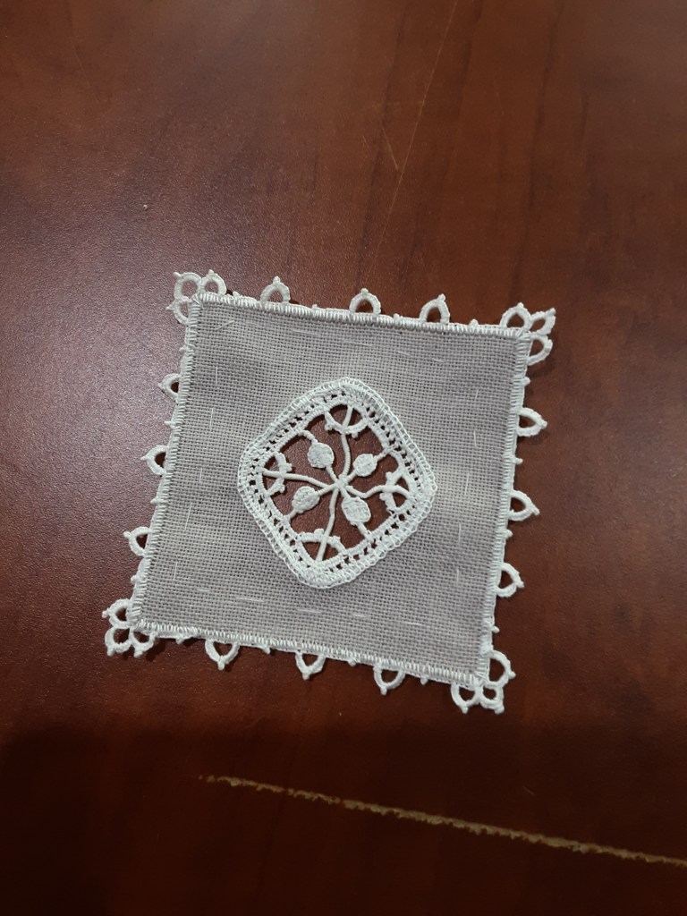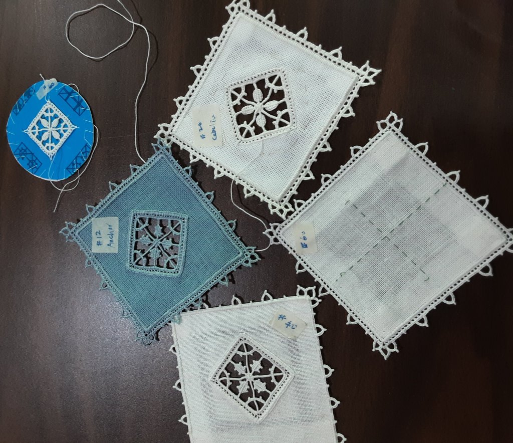 In recent weeks we worked on Aemilia Ars needle lace and completed items shown in our photos. Judy finished a Hardanger mat with a unique edging as well as several Punto Antico and needle lace ornaments. We are now carrying on with projects in Richelieu cutwork, pulled thread, reticella and Ukranian whitework.