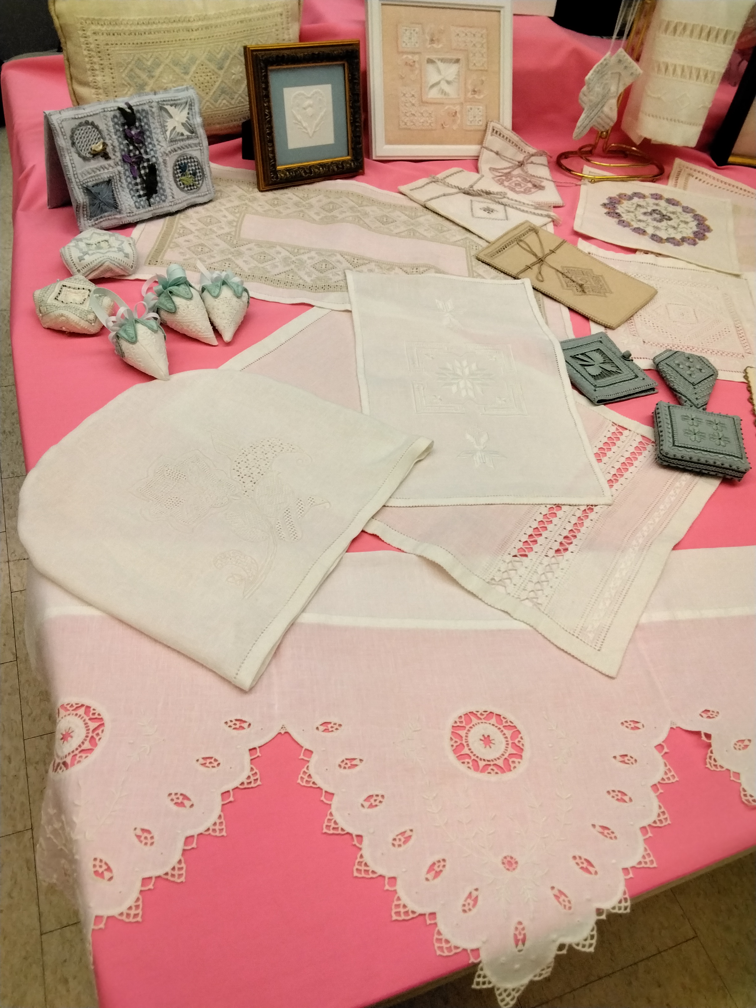 Members of the Association for Whitework Embroidery enjoyed attending and mounting a display at the ONN exhibit day in Guelph. It was interesting to see the work of so many diverse groups and to meet folks from other guilds in Ontario. For those who missed the exhibit, we have included two photos of our table.