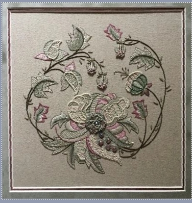Elizabethan embroidery is characterized by an abundance of stylized flora and fauna motifs in polychromatic colours set amongst twining, swirling, vine borders. Often metallic braids and spangles are added for a touch of bling and whimsy.