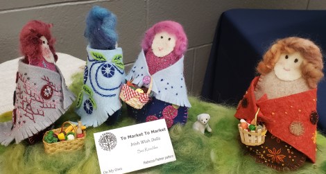 Another exciting stitching year is here. The Guelph guild has completed its registration and currently there are eighty-six members. This is comparable to last year. We find that a few members leave and some join in equal numbers. Often new members join after attending our spring Open House and many come with friends looking for new hobbies/activities. We also do outreach events that draw new members. This year’s events were Weftfest in May, and the Aberfoyle fall fair in September. This fall fair event includes a ‘make and take’ project for children. This year we taught over thirty kids of all ages to sew on buttons and stitch up pieces of felt to make stuffy ‘Dots”. Here are three photos of their earnest efforts. We also are displaying our members’ fabulous projects in a branch of the Guelph public library and the Evergreen Seniors’ Centre in the fall.