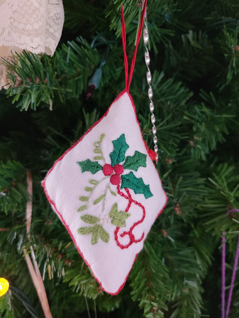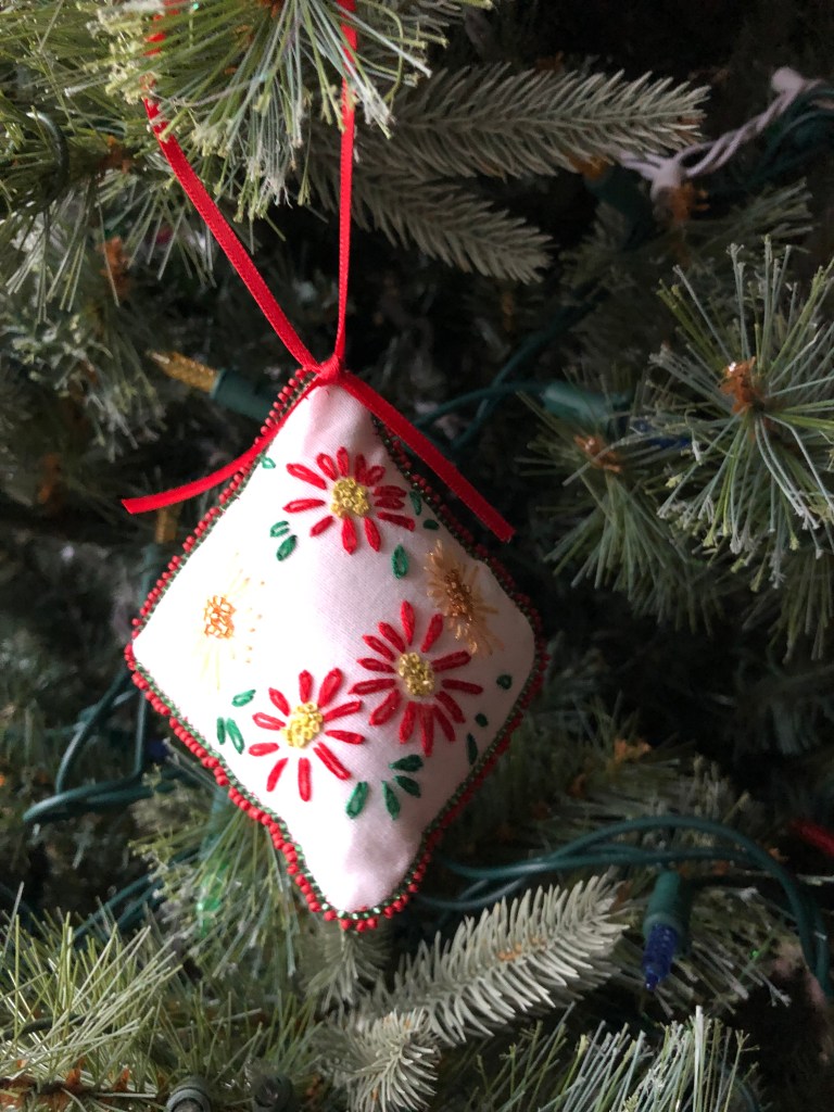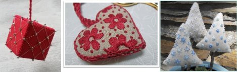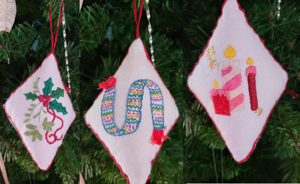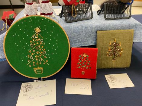 In October, we did an exercise in stitching on dark fabric. In November, we had 2 online sessions to create Christmas ornaments.