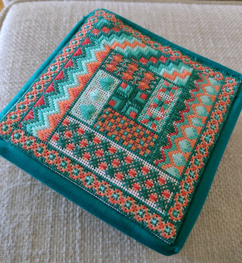 Stitch With Confidence with Bonnie Evans is for anyone new or needing a refresher. Laura Dobrindt is teaching A New Look at Stumpwork. I’m in the class beside hers and I saw some beautiful needlelace last week! Pat Bowley is presiding over Slow Stitching. Each person will be working at their own pace on their unique project. I’m co-ordinating the Pocket Project where we are discussing how we take our projects along to waiting rooms or on vacation. We are stitching away at little scissor keeps, tiny pincushions, etc.