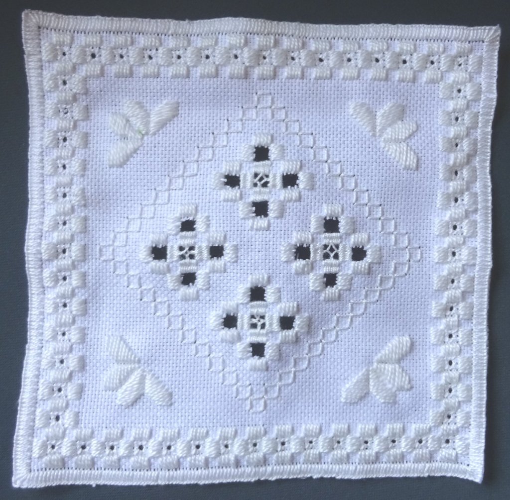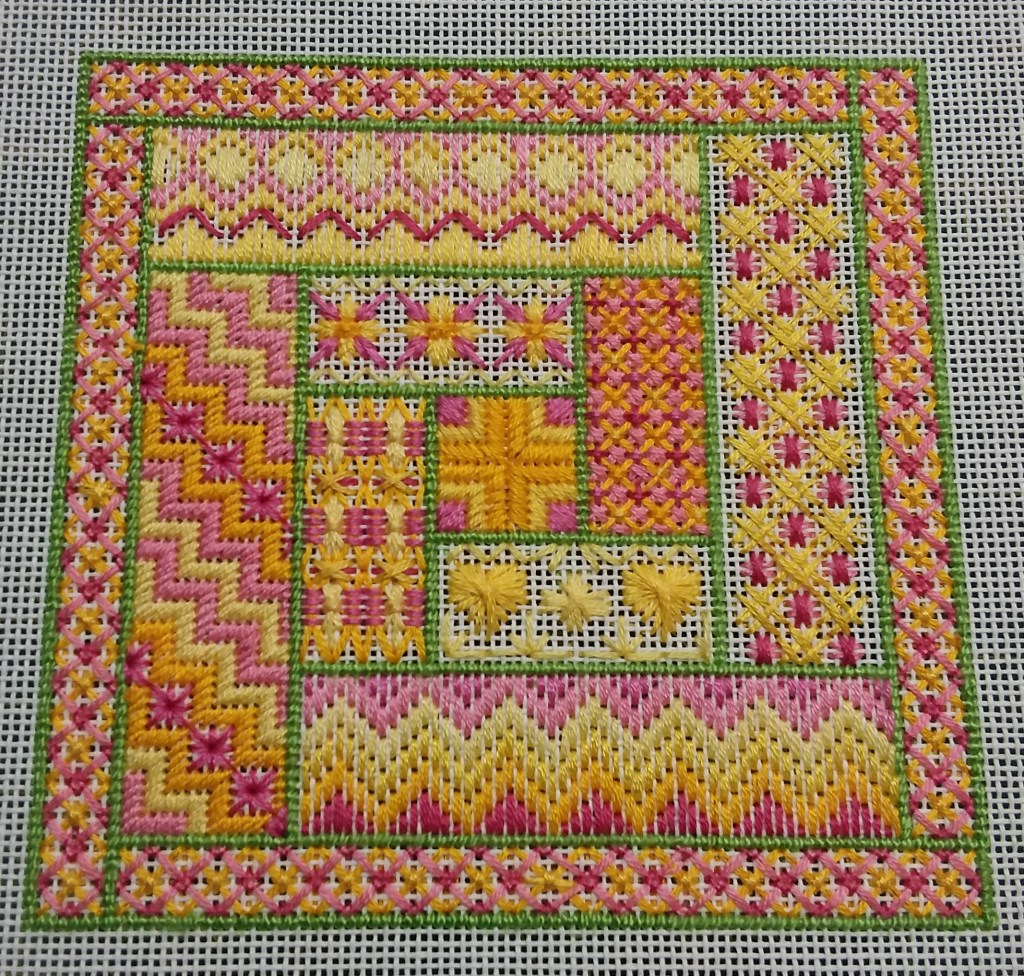 March was a hands-on session guided by Alison Jackson. Alison sent out the pattern by email beforehand with suggestions for threads and colours. It was a couple of charming little scenes that could be completed with whatever you had in your stash. I haven’t received any photos of that one yet but here is one that I managed to stitch up. I didn’t restrict myself to floss so some of the areas may be a little chunkier than Alison’s sample photos. Alison has given us an extra incentive in that all those who send of photo of a completed landscape will be entered in a prize draw.