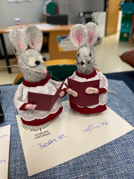 Our Christmas workshop, also held in November, got us motivated to stitch Christmas ornaments and gifts. Here are some photos of the button snowman, the gold Christmas trees and the cute mice, all ready for Christmas. Each guild member selected one of the six offerings. We left with completed or almost completed ornaments and extra calories from the treats brought in by members. We also contributed to the food bank which is active in the church where we meet.