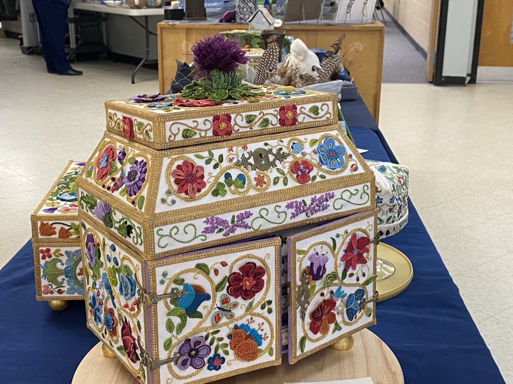 The Library Committee researches books and magazines to accompany the items brought in by members. The most amazing piece was the chest stitched by Heather Brighton with stitching on all sides and even the drawers! This will be on display at the Open House, and it must be seen in person to be appreciated.