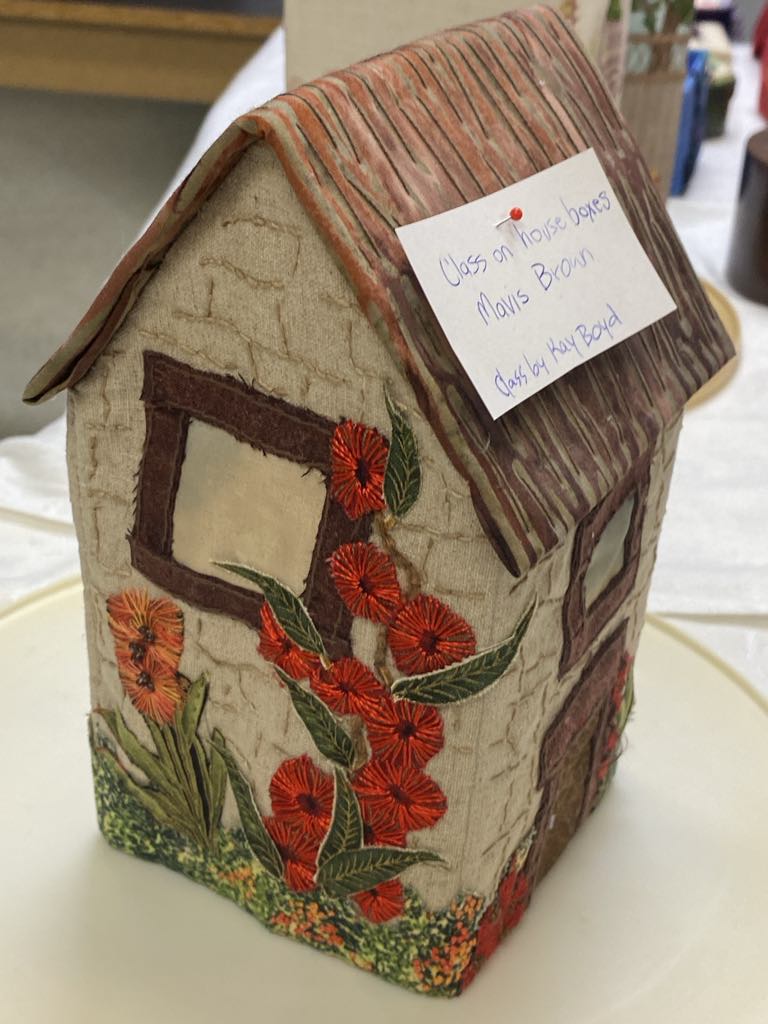 As a service to our members, we always keep a store of blank cards with apertures for a small embroidery – “holey cards”! Ruth Douglas gave us a refresher on how to install your little piece into the card for maximum effect. For example, a small piece of felt or thin batting behind your piece gives it extra oomph.