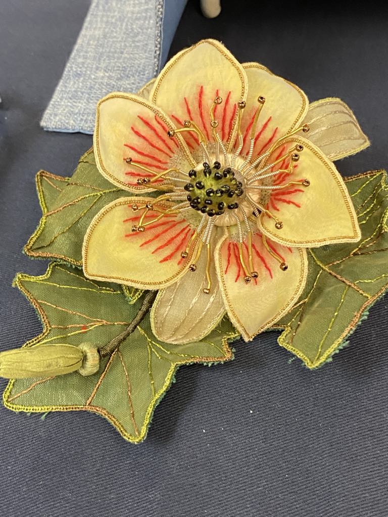 Classes this winter were goldwork, combination stitches, faces in stumpwork, sewing box, kantha interpreted, blackwork and our usual independent group. In the afternoons we enjoyed making mini “chocolates”, needle felted birds, a Sorbello stitch workshop, a slide journey to Italy with Mavis Brown.