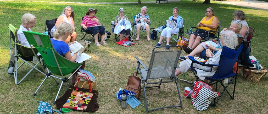 We had fun at our stitch in the park events in June, July, and August. Anyone who is interested can join us for some stitching and catch up at Riverside Park. We had fabulous weather this summer and lots of stitching and laughter. If you do not already do this, we highly recommend it. Here is a photo of us gathered in the park.
