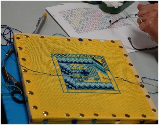 Beginning in October, Ana Maria Kramer was our guest instructor for some Schwalm embroidery, a sampler of the technique to be made up as embroidery accessories – pincushion, needle-case, and scissors fob. These sessions were interesting and our group rose to the challenge. Thank-you Ana Maria.