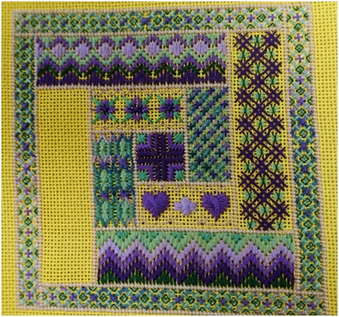 Counted canvas work occupied much of our time in Kitchener-Waterloo this fall, beginning with an outing to London’s Stitch It Central to gather supplies. The project was led by Maria, a founding member of the KW guild, and who has had much experience in counted canvas work and cross stitch. As you see, the background colour and thread choice can create such different pieces using the same pattern.