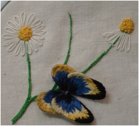 A few members have reported some success in completing their UFOs, as with this butterfly that was begun about two years ago with our stumpwork class.