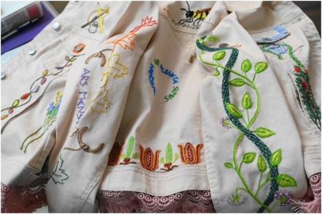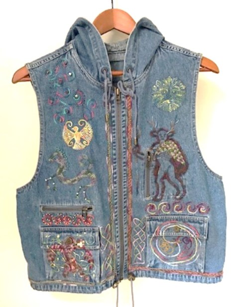 Another member, despite being very far from home in the early days of the pandemic, did not let that deter her from several creative embroidery endeavours. The jean jacket was embroidered with Celtic mythology symbols.