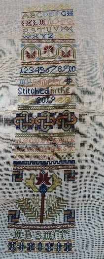 From Maria, we have a cross stitch piece with roses, tulips and violets. Included are close ups of parts of it. The designer of “Keeping Tradition” Anne Van Damme is from Belgium: