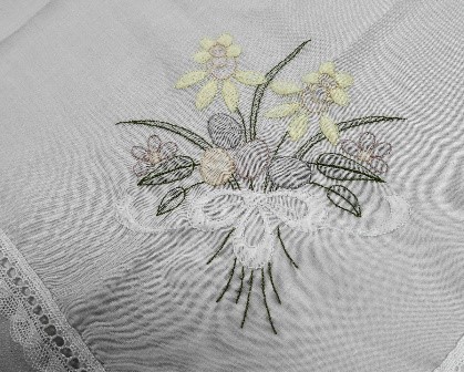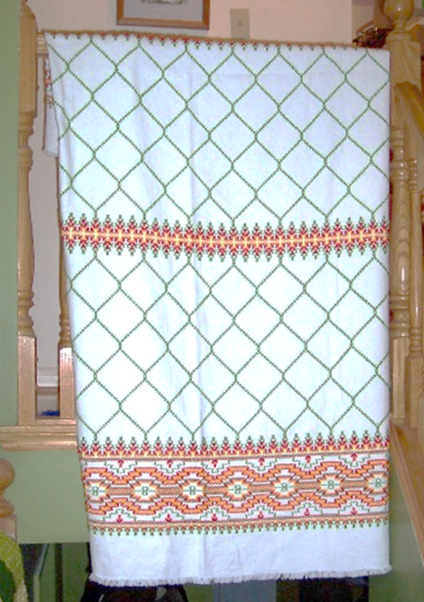 From Karen, we have a cross stitch tablecloth that her mother started some time ago: