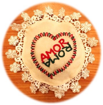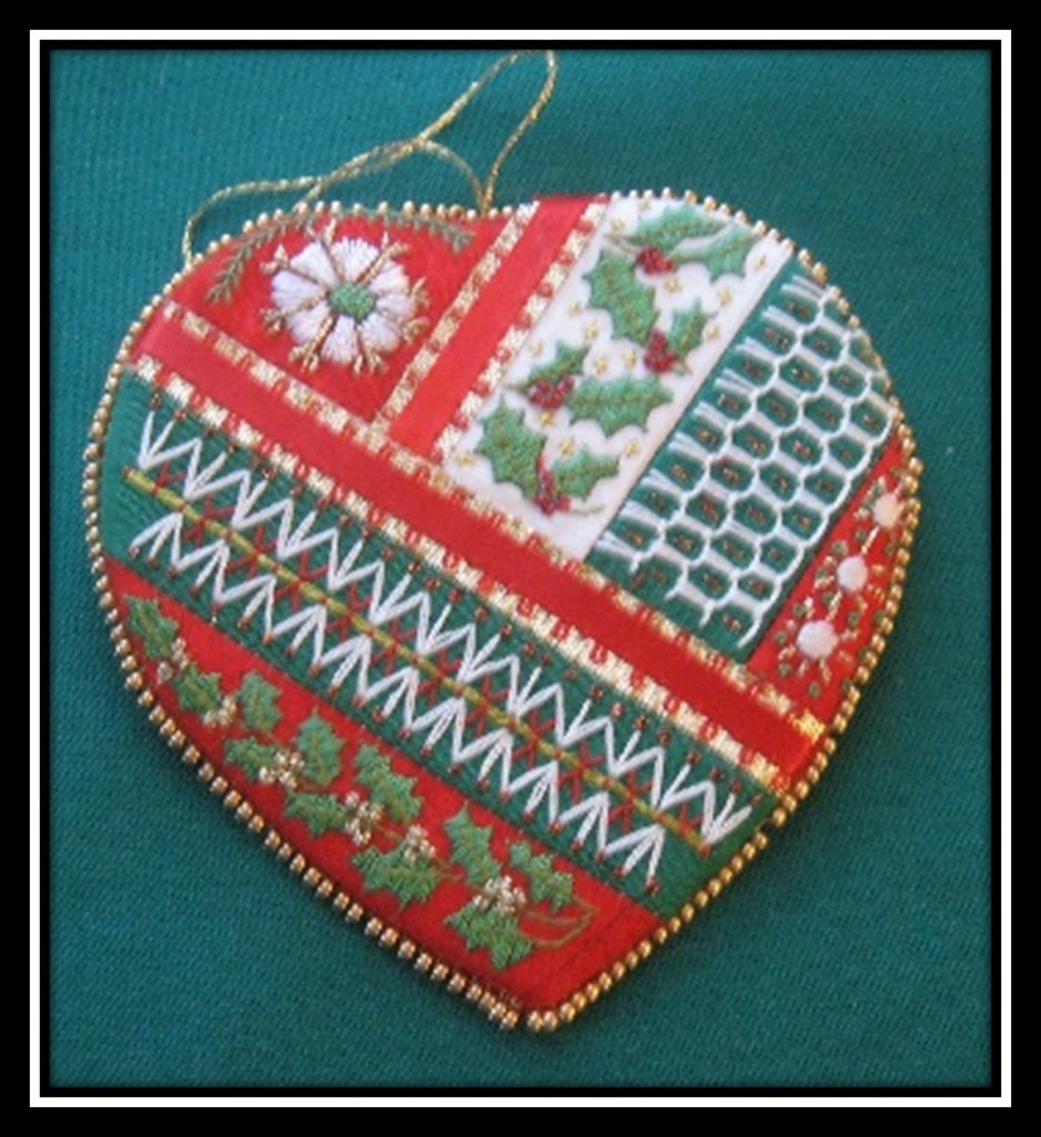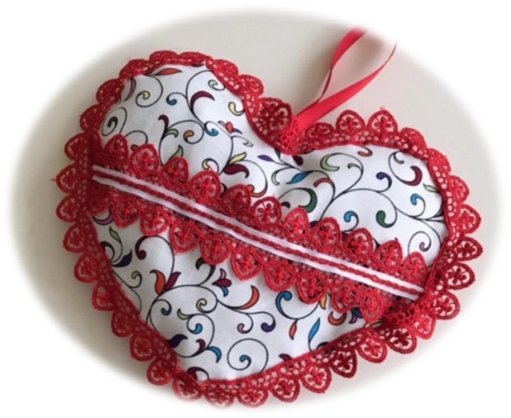 A challenge in early January to make something ‘heart’ related by February 14 rendered a variety of results. Hilary G. stitched a lace-trimmed heart using silk and silk thread which she purchased in Rome, as well as a potpourri heart.