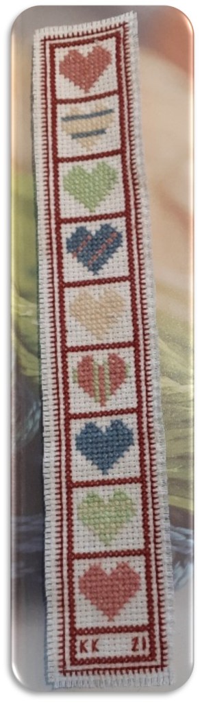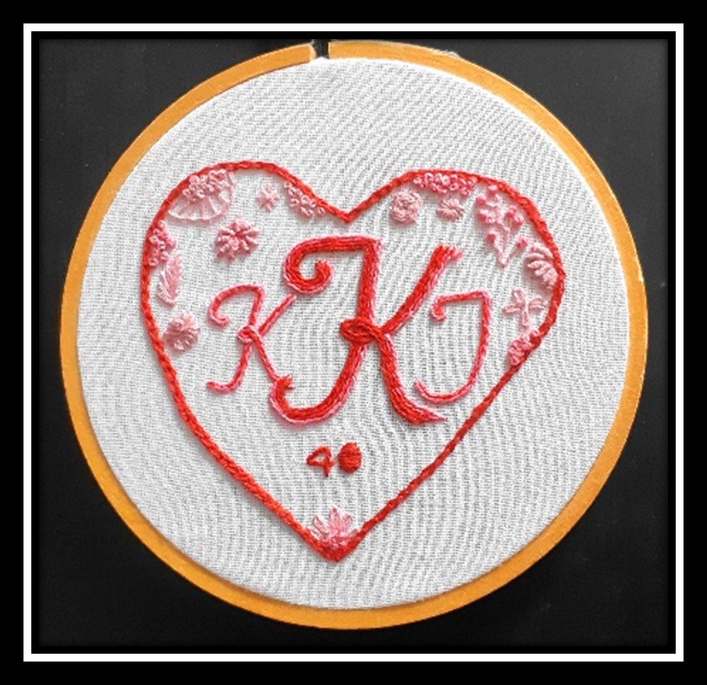 Karen K created a heart monogram sampler in honour of her 40th wedding anniversary. She incorporated many stitches that we have learned and used on past projects during our guild meetings, including Bullion, Blanket, Chain, Eyelet, Feather, Fishbone, French Knot, Lazy Daisy, Ribbed Spider Web, Satin, Star, Stem, Straight and woven wheel stitches. And to top off that lovely piece, she made a heart-themed book mark AND heart cookies.