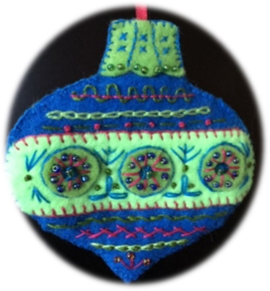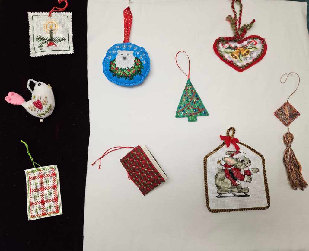 The KW chapter of the Canadian Embroiderers’ Guild just wrapped up its holiday party, with our ever popular ornament exchange, pictured. This term, we worked on some great projects including a gradient canvas piece that has been the object of desire for many of the members. We look forward to reconvening in January and hope the weather will be in our favour.