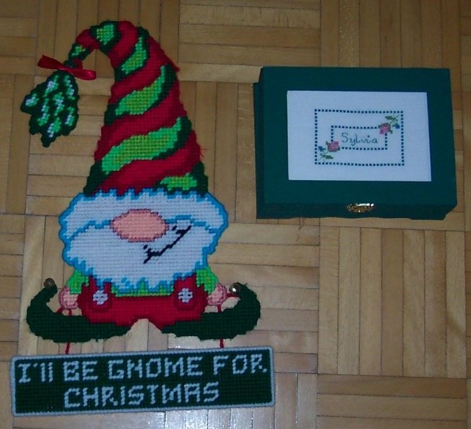 The needlepoint gnome is keeping a Christmas gift company. It is a painted wooden box with a cross-stitch insert under glass.