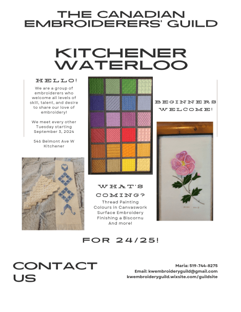 Welcome to a new year of stitching with the Kitchener-Waterloo branch of the Canadian Embroiderers’ Guild at the Grace Mennonite Brethren Church located at 546 Belmont Avenue, Kitchener. We will be starting our meetings on September 3, 2024. Meetings will be from 7 to 9 pm as per previous years. I am looking forward to the gathering of the stitchers. So nice to be surrounded with people of like mind.
