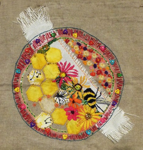 We are jointly working on a bug book that we want to bring out – every member can submit their bugs in any way shape or form, and the photographs will be compiled in a book. Amira just sent us her one submission, she opened a can of worms, it seems! And Debbie expressed her love of bees in an embroidery piece.