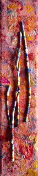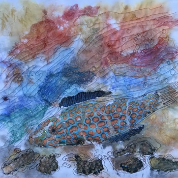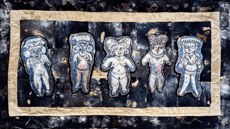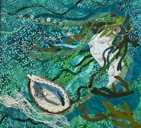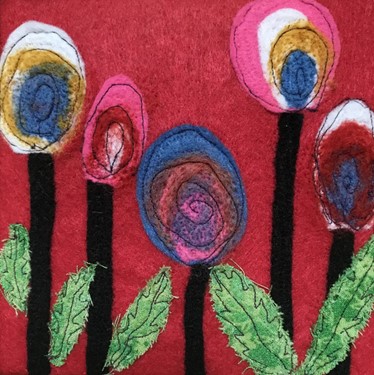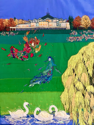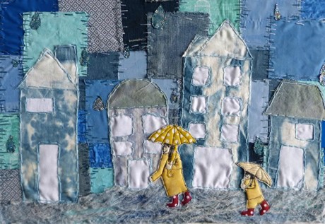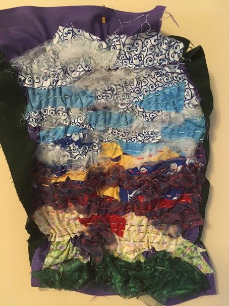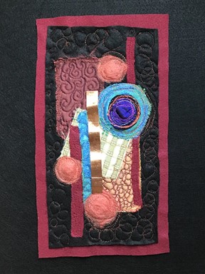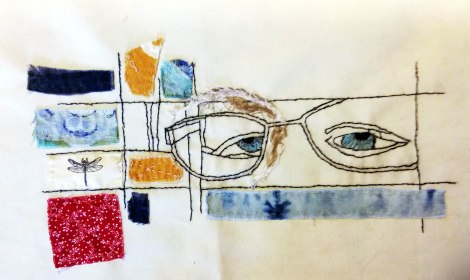 Fabric collage, sewing machine embroidery and painting made by Roberta Eustace.