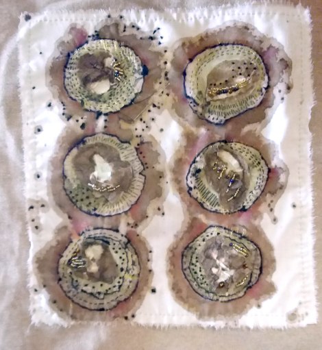Janet has been playing with free-motion stitching on her monoprints on fabric. One of the pictures is actually a print on paper, with Gordana taught circles on black felt superimposed on top.
