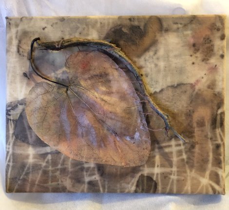Liz skeletonized a leaf (cooking it with washing soda and gently washing away the pulp), and incorporated that into an embroidery.