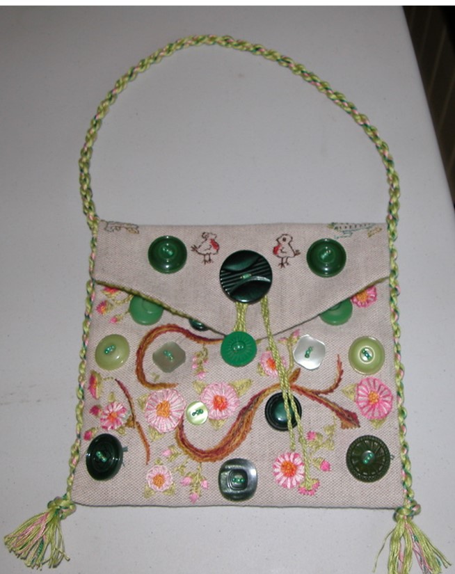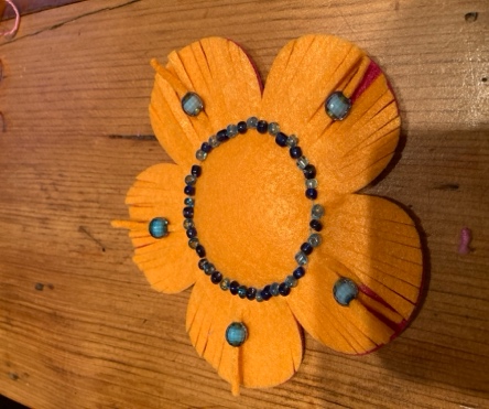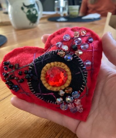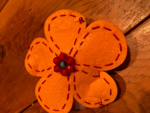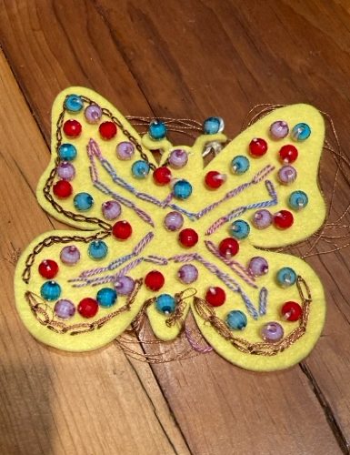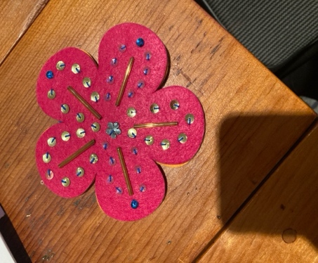 To make pin cushions we used felt shapes from Dollarama such as butterflies, flowers, and hearts. We embroidered the surface with beads and embroidery stitches, when finished we blanket stitched the edge of felt together while putting stuffing in to make a pin cushion.
