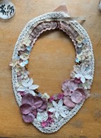First picture, sewing circular weaving projects together, a knitted fish and dollies to create a fantasy seascape. Second picture using felt and yarns to make a 3d clam shell.