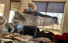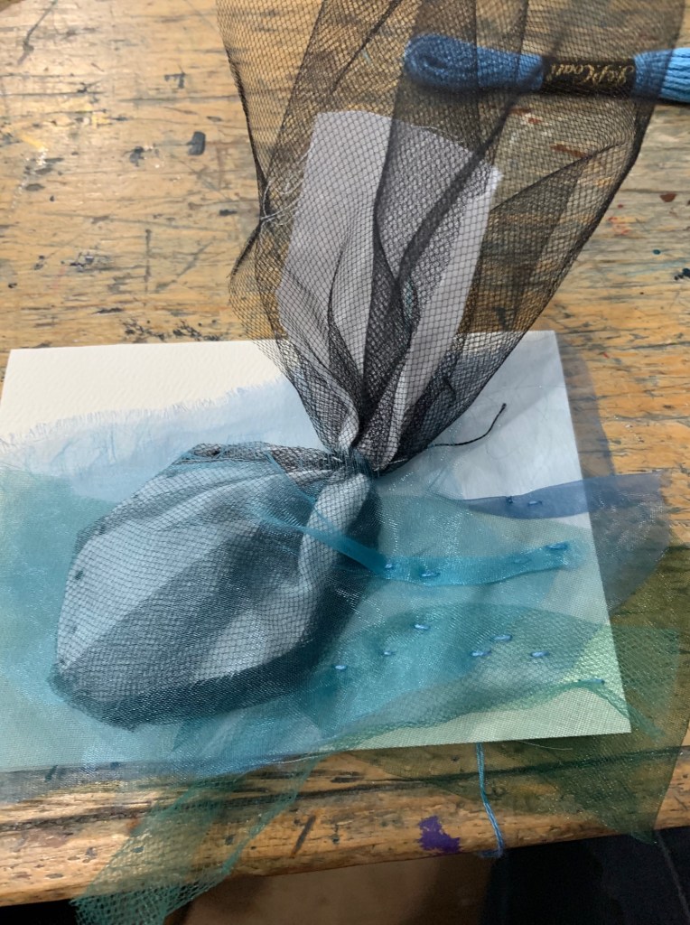 Cheese Cloth mini workshop, cutting pieces of cheese cloth to match the shape of the image, layering the cheese cloth on the image like a gray scale picture.