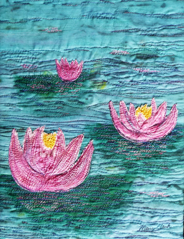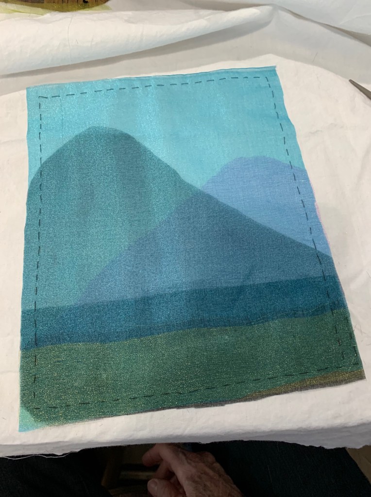 Also two pieces by Barbara Hodkinson, who works on water-colour prints on fabric, one piece by our remote British member Wendy Nicholson, one piece by Roberta Eustace, and three by Debbie Bianco.