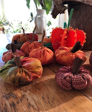 Making pumpkins is very easy. It’s similar to making a tomato pin cushion. You cut a big circle of fabric, run stitch around the edge, add stuffing, gather in and viola. Add a stick or piece of felt for the stem.