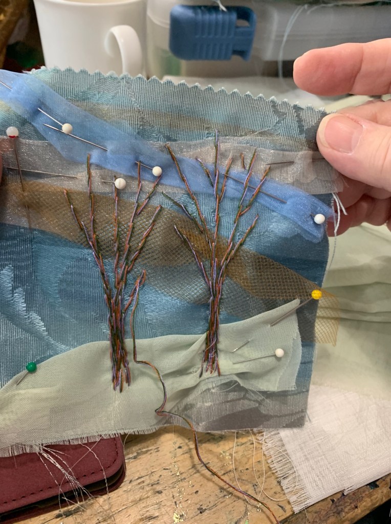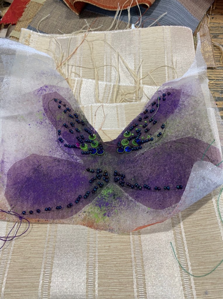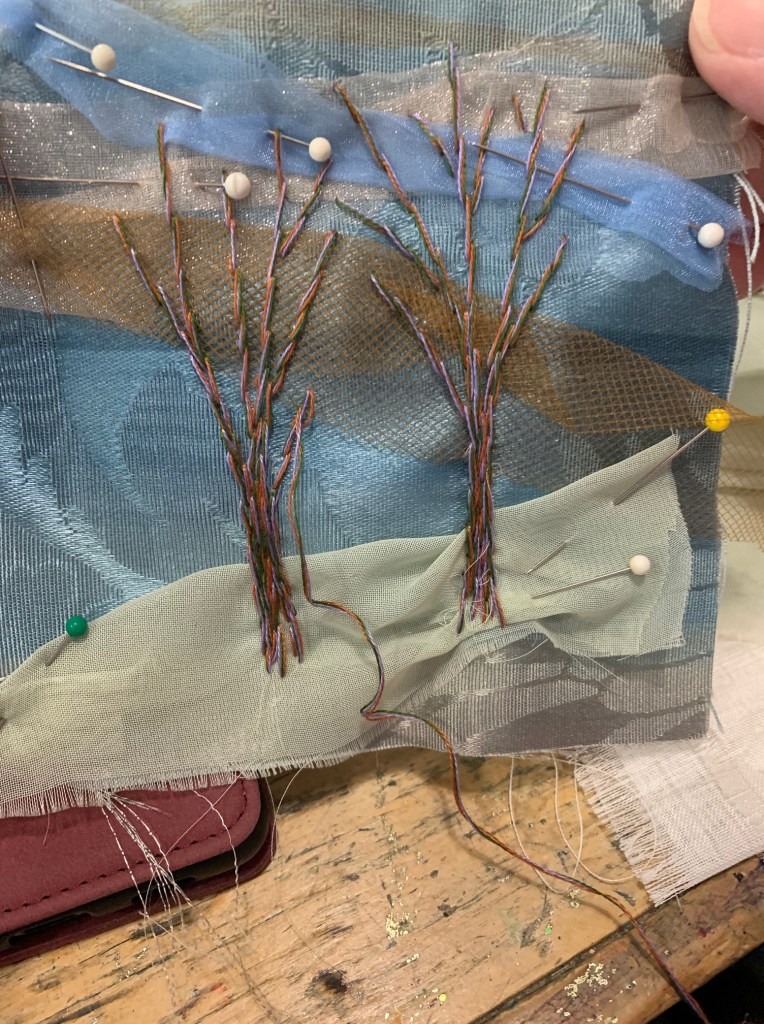 Mind mapping is similar to mind mapping on paper. You close your eyes put a pen on a piece of paper or fabric and think of a place you been to and walking around that place moving your pen to where you walk. You stitch on the lines and add pieces of fabric and beads for special effects. When Gemma drew her mind map she saw three growing sprouts and worked on that through stitchery and fabric scraps.