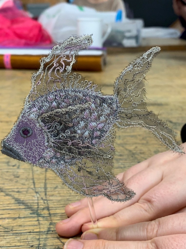 In January, the Oakville Stitchery Guild meeting was a mini workshop with transparent fabric led by Joan Linda. Her embroidered fish was her demo.