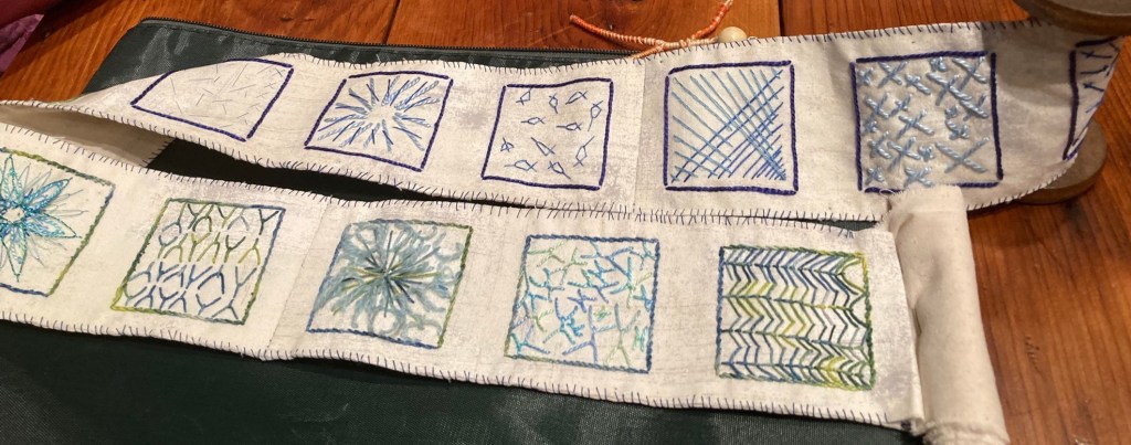 Our last meeting was on November 28, 2021. We had to close down the meetings in December due to new restrictions in Oakville of 5 people per meeting. We been keeping in contact over email and will be meeting in person soon on March 27, 2022. Here’s some art work that our Oakville Stitchery has been up to.