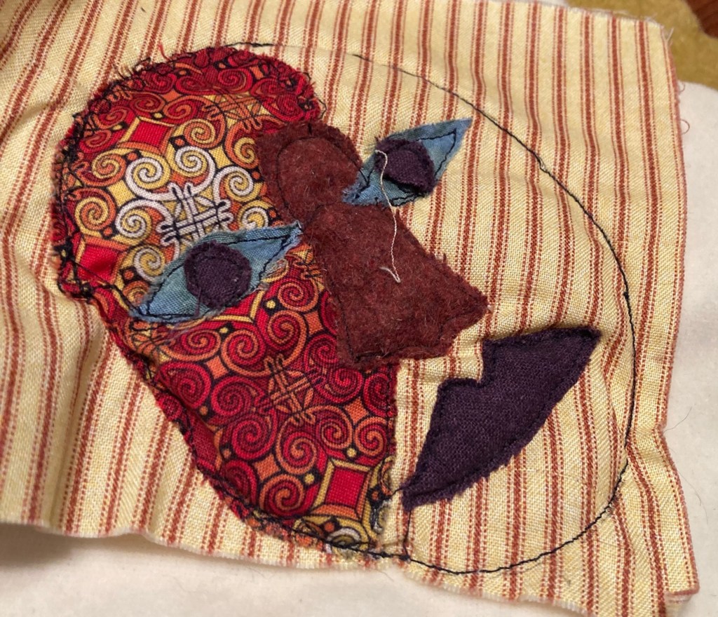 Pin fabric scraps to the main background fabric. Running stitch away.