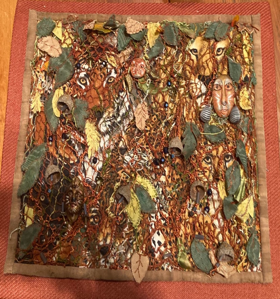 Joanne has been keeping busy this summer making faces inspired by the Making Faces in Fabric book by Melissa Averinos. She is also working on a tiger fabric collage embellished with fabric, lace and faces.
