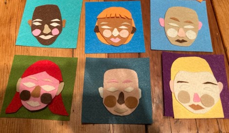We made textile collage of faces using cotton fabric, jeans and felt.