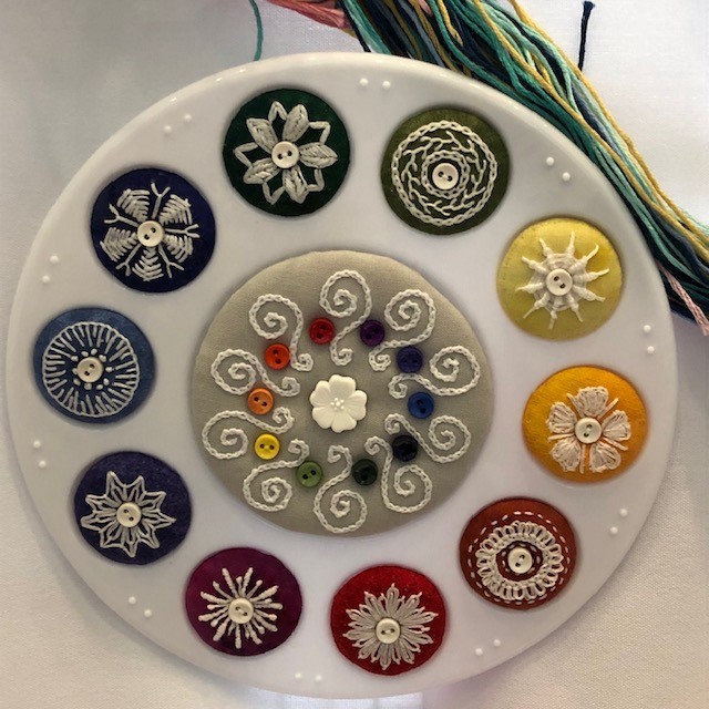 September 4th: Members were given a kit to make a pin cushion using an IKEA cork coaster. Members could stitch French knots, satin, seed, chain stitch, etc., to complete the surface embroidery. The original idea was from Meagan Mather of Kimat and she also kindly lent us a stamp for the fabric.