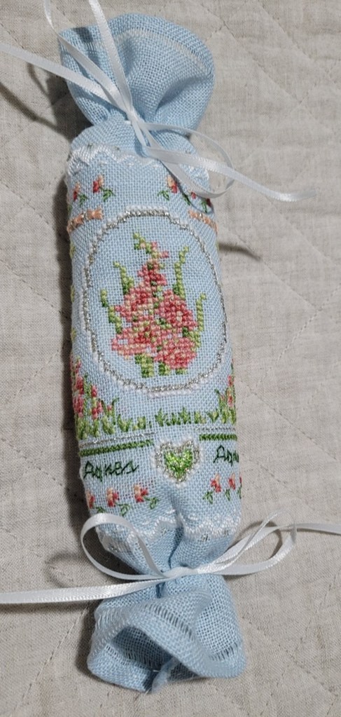 Every member received a Christmas Gift in the mail with fabric, a tea bag, a chocolate and a pattern to stitch a teapot. Jenny went further and stitched her favourite cookies to be a fob set!