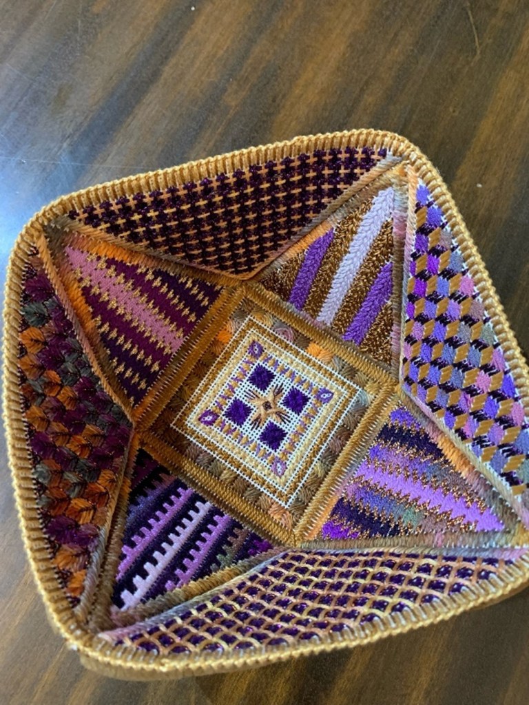1. Legacy – we asked each stitcher to put themselves in their stitching so we “know them” by looking at a piece no bigger than half a page. We will stitch these together so we can say “I remember her” or “she does that technique”!