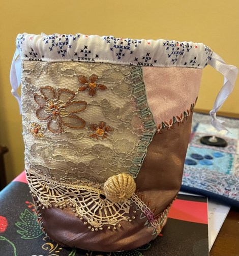 3. Challenge – Usually related to the presentation asking members things like “stitch outside of the box” where we saw tennis rackets, colanders, safari hats decorated. We had an awesome presentation by Judy Eckhardt on Crazy Quilting and if anyone needed stash our Program person put a few things in an envelope and sent it off! We just had Pat Bowley excite our group with mindful stitching so I know of a number of projects coming to show and share from that.