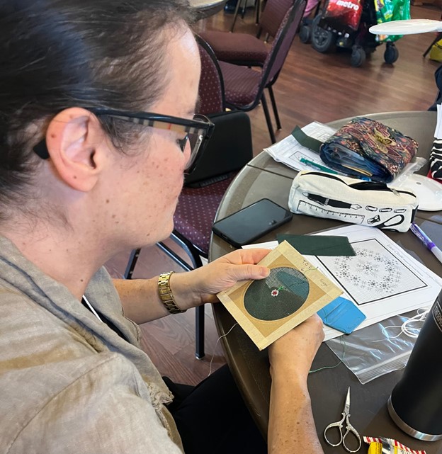 During the summer break, members have the opportunity to gather at one members cottage or at another’s apartment building meeting room. We bring our projects, stitch and have fellowship. It’s a lovely way to stay connected during the sometimes busy or sometimes quiet summer months.